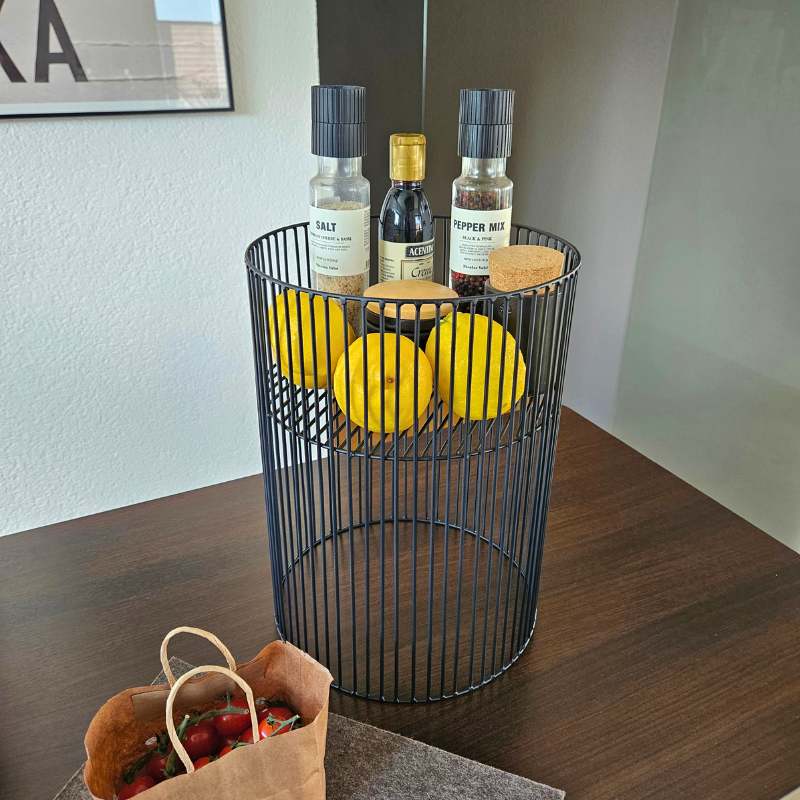 Ein besonderes Detail: Der Metallkorb ist beidseitig nutzbar. Mit höherem Boden bietet er mehr Stauraum, während die flachere Seite einen offenen, luftigen Look schafft. So lässt sich der Korb flexibel einsetzen – als Obstkorb, Brotkorb, für Pflanzen oder als dekoratives Element auf Tisch, Sideboard oder in der Küche.