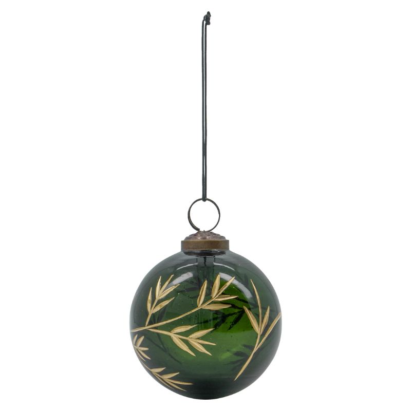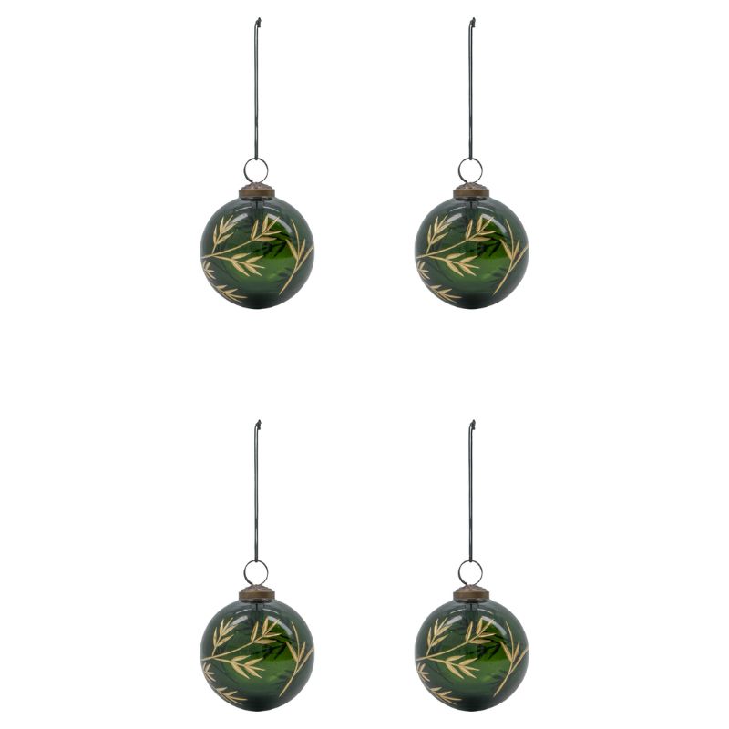 Diese tiefgrünen Kugeln bringen Glanz in dein Weihnachtsfest. Im Set findest du vier ganz besondere Anhänger – jeder ein kleines Kunstwerk mit einem eleganten Zweigmuster im Vintage-Stil, das von Hand mit goldener Farbe veredelt wurde.